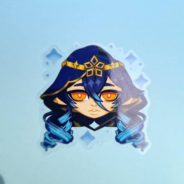A 5 by 4.9 cm vinyl sticker, with a transparent background.