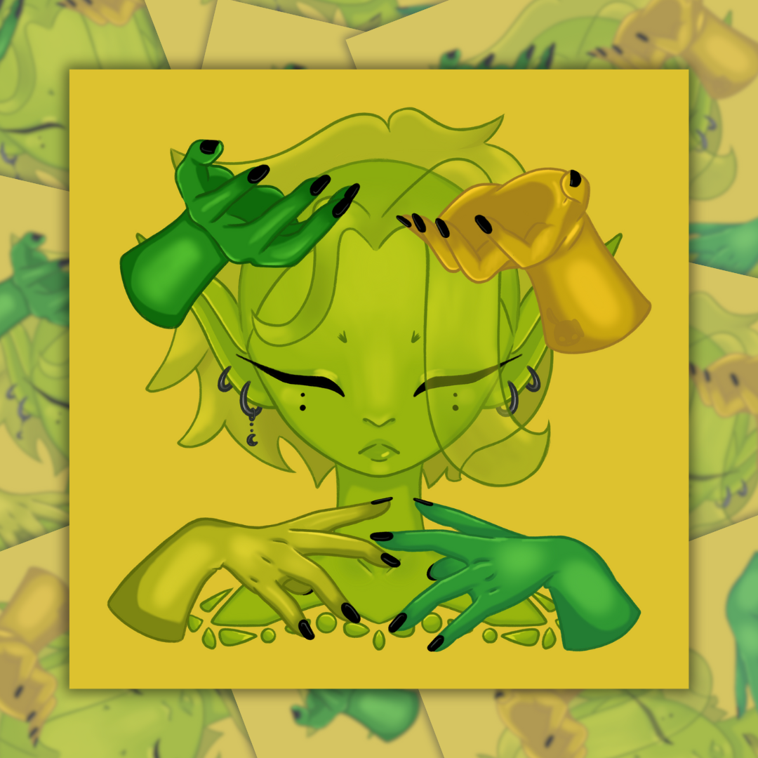 Ambition’s sharp edge. Emerald (growth) gilded by yellow (aspiration), personified as relentless focus. A hunger to gather, build, and elevate.