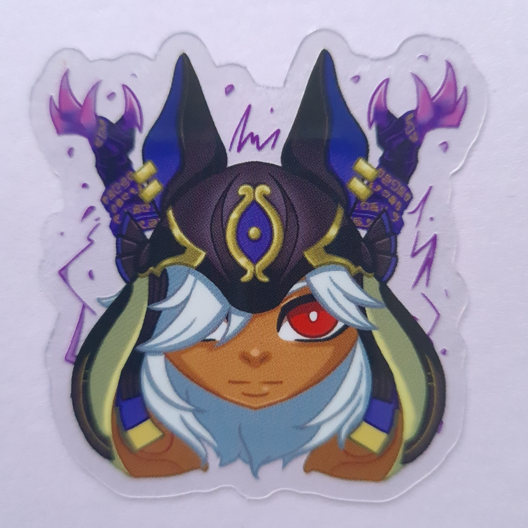 A 5 by 5.1 cm vinyl sticker, with a transparent background.